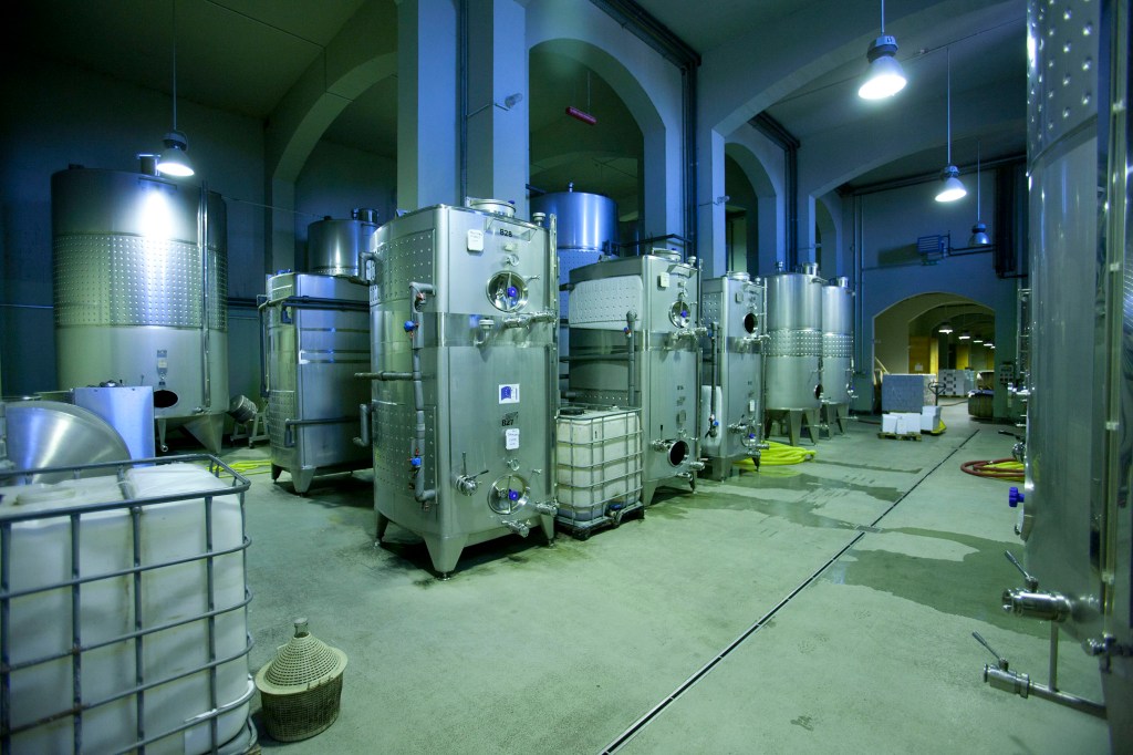 The winery cultivates about 50 hectares divided among four major vineyards, each of which used to belong to the Abbey in the historic past. The new vines planted under a program started in 2001 are spaced at a distance of 2.4 x 0.8 m; the training system is Guyot. The goal was to achieve a planting density of over 5000 vines per hectare in order to significantly cut the yield per vine to harvest much better quality fruit. The Abbey Winery strives to keep an optimal balance between modern mechanization and fastidious manual labour.