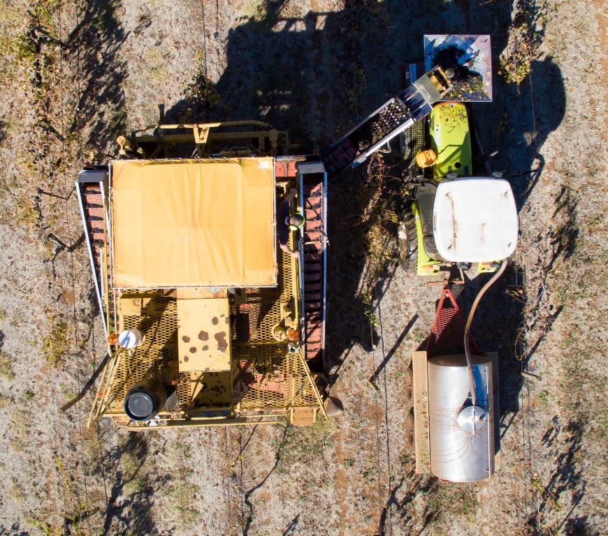 Since 1980, the grapes have been mechanically harvested and crushed ‘in the field’ by a crusher mounted on the front of a tractor. The must is transported to the winery in a stainless steel tanker towed behind the tractor.